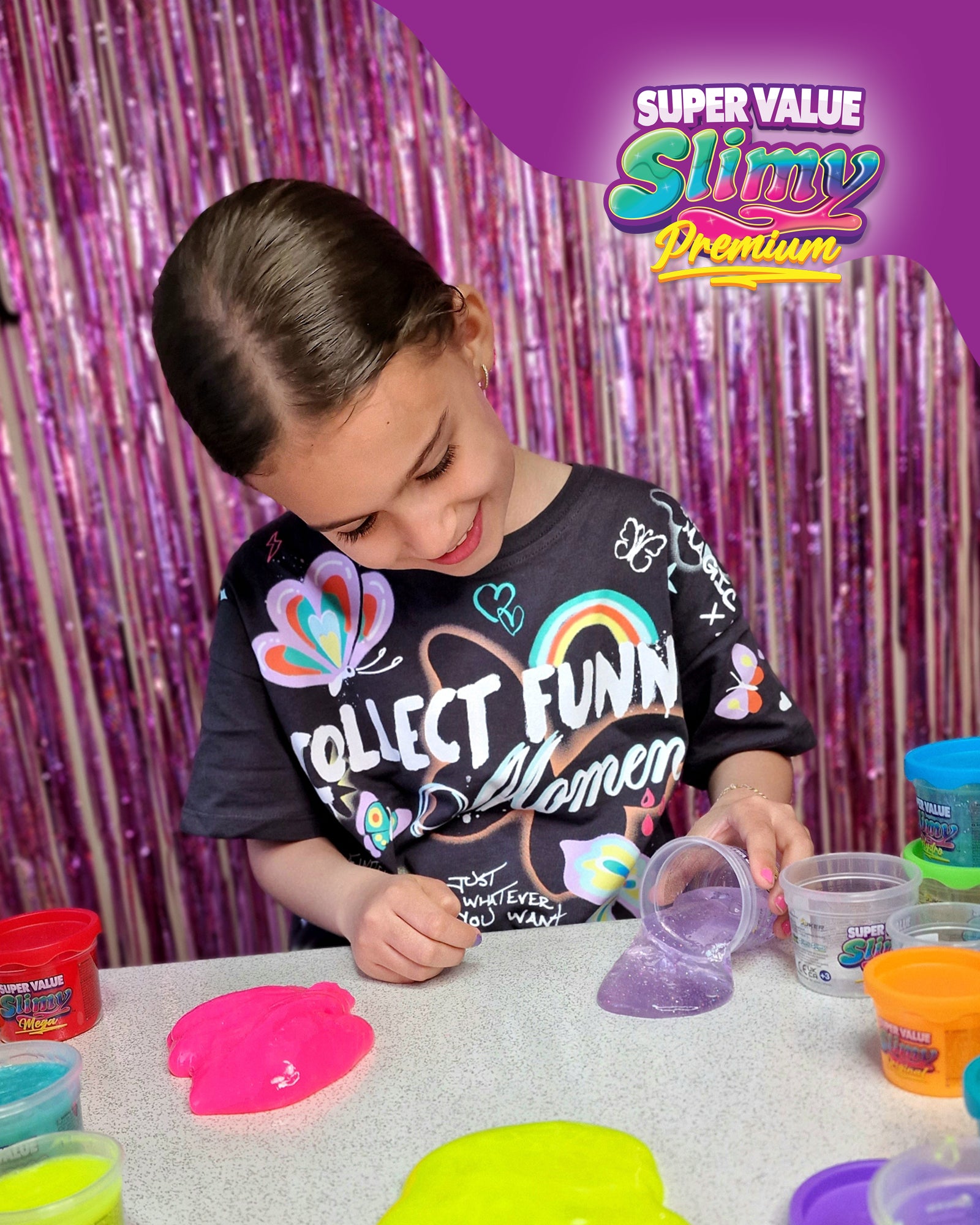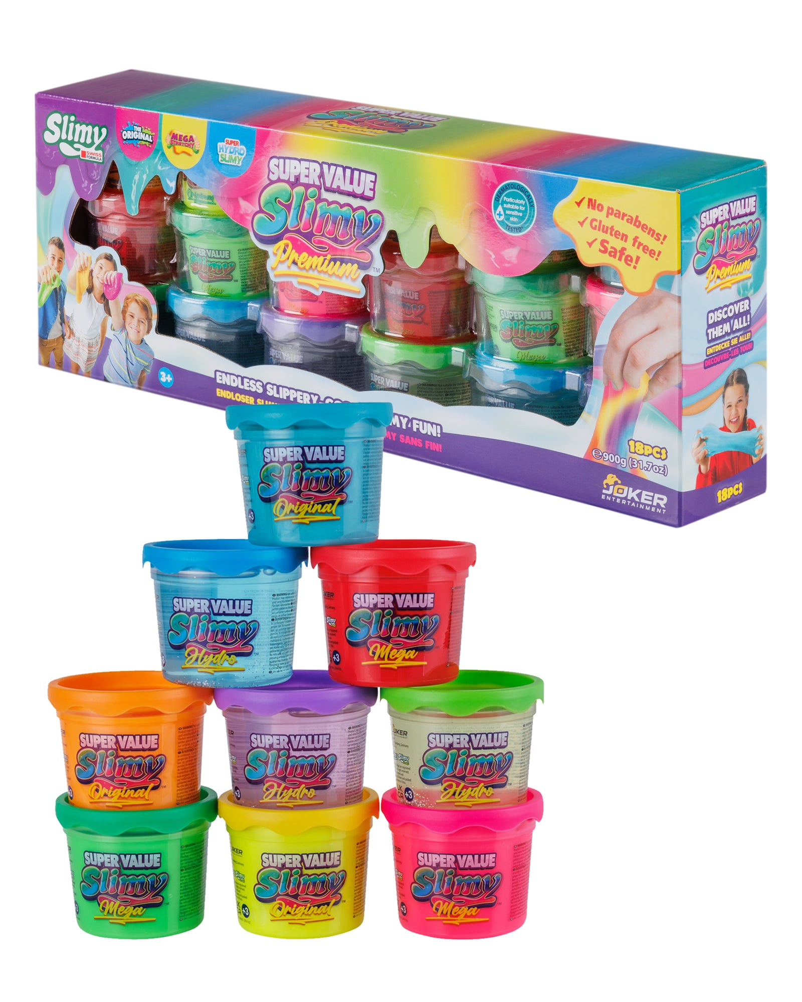 NEU - DIE SUPER VALUE SERIE von Original SLIMY! PREMIUM-QUALITÄT ZUM SUPERGÜNSTIGEN PREIS! Drei der beliebtesten Original SLIMYs in einer BOX: Original Metallic, Super Mega Stretchy & Super Hydro Slimy! In 9 leuchtenden Farben! 900g verschiedenen SLIMY®-Sorten als perfektes Geschenk für alle Slime-Fans! Perfekt für jede Gelegenheit! Quetschen, ziehen, rinnen lassen oder mischen, um die eigenen einzigartigen Farben zu kreieren! Die sichersten SLIMYs aller Zeiten - ohne Parabene & glutenfrei nach Schweizer Formel! Die beste Qualität aller Zeiten! Dermatologisch getestet für unbeschwerten SLIMY Spaß! Geeignet für Kinder ab 3 Jahren!